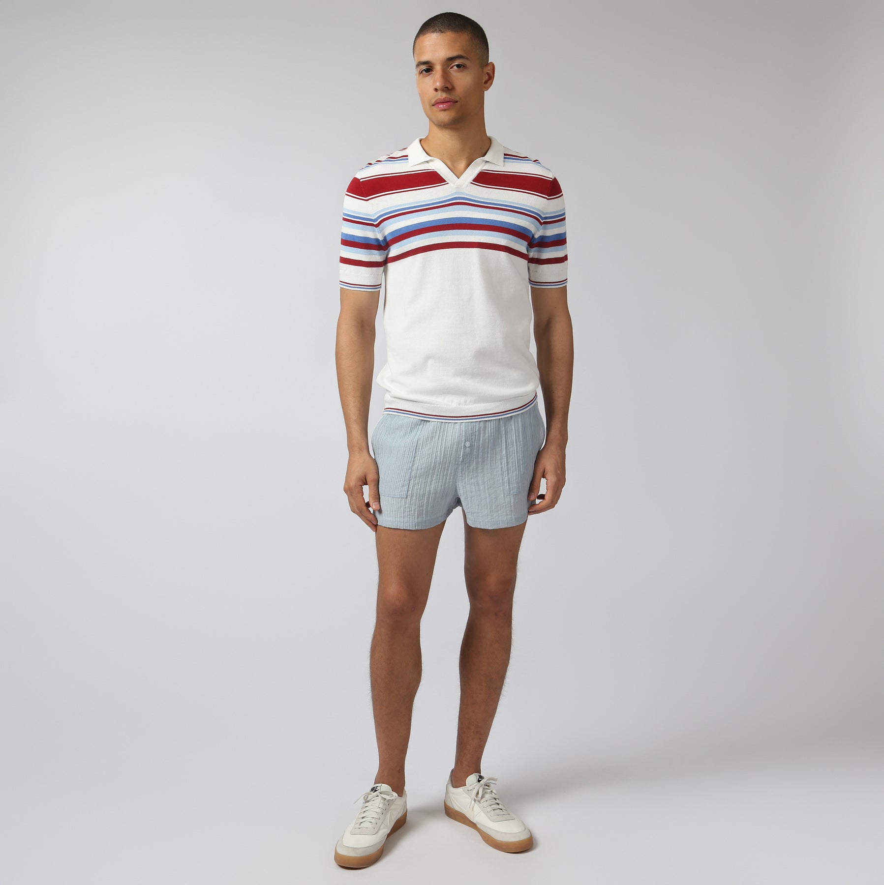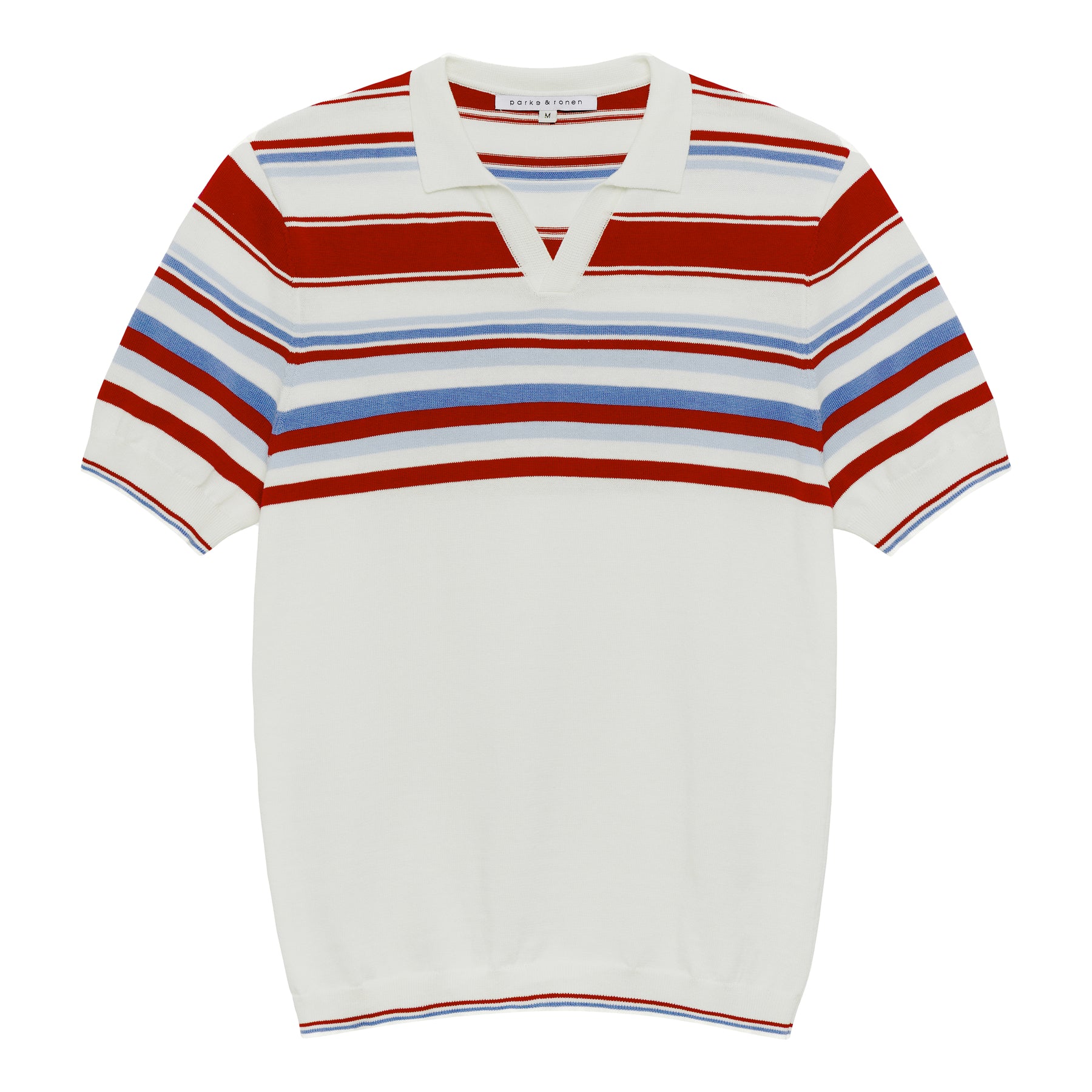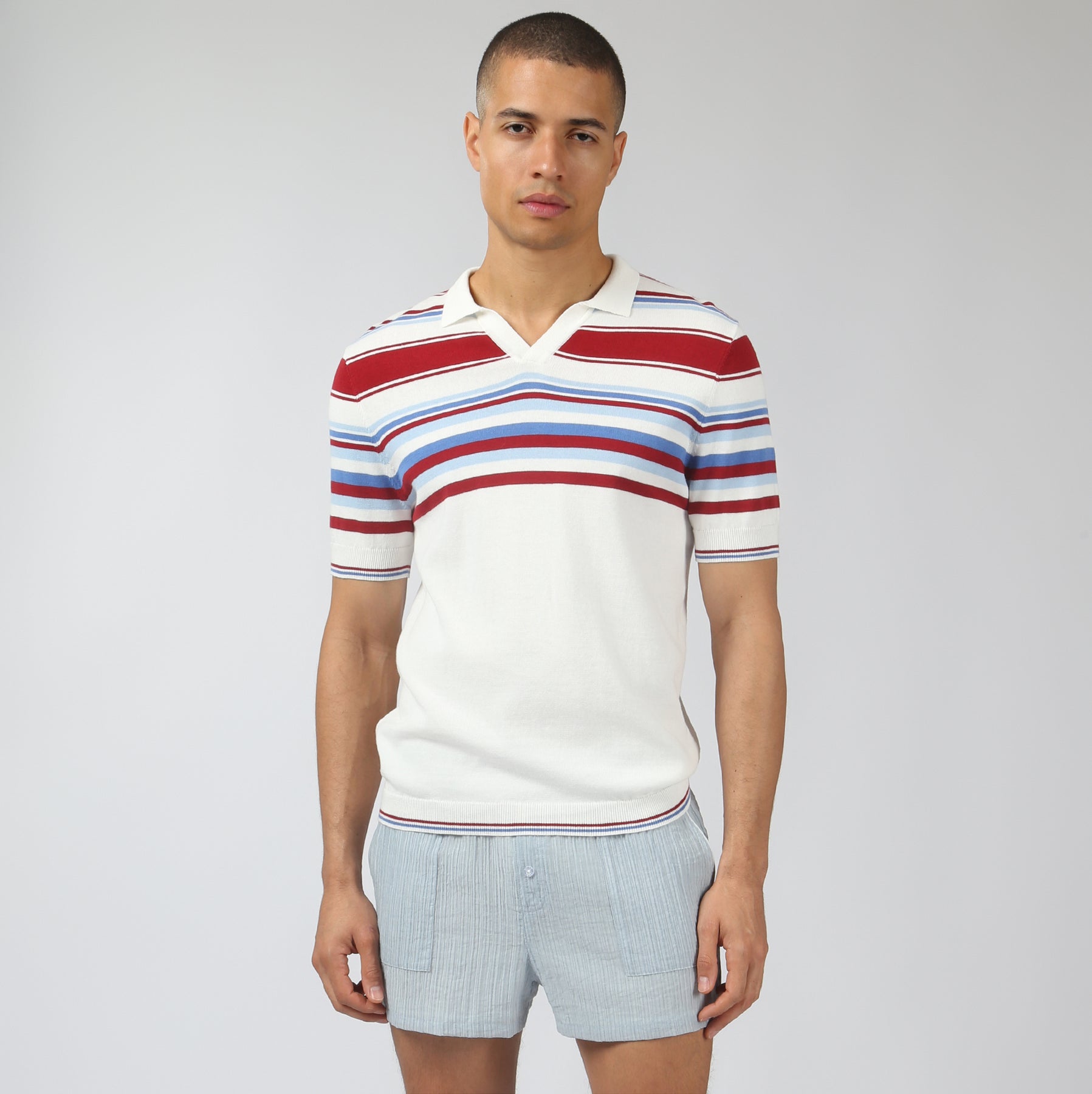 Finished with dynamic, colorful stripes across the chest, this knit polo adds movement and personality while staying refined—polished enough to dress up, relaxed enough for everyday wear.