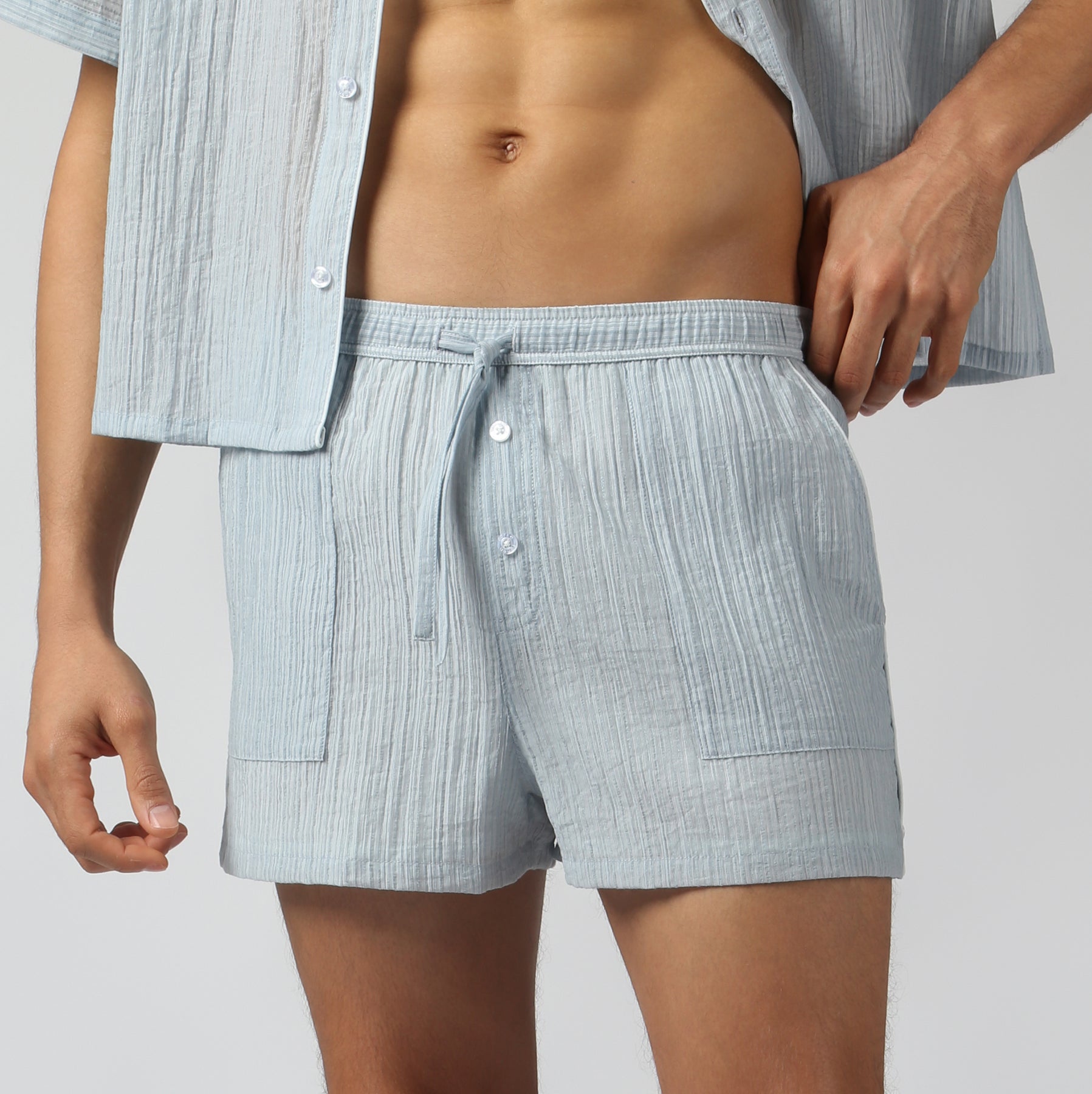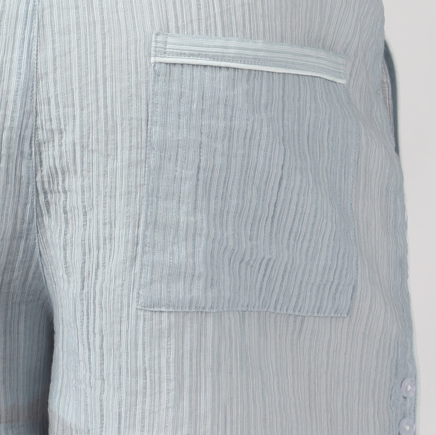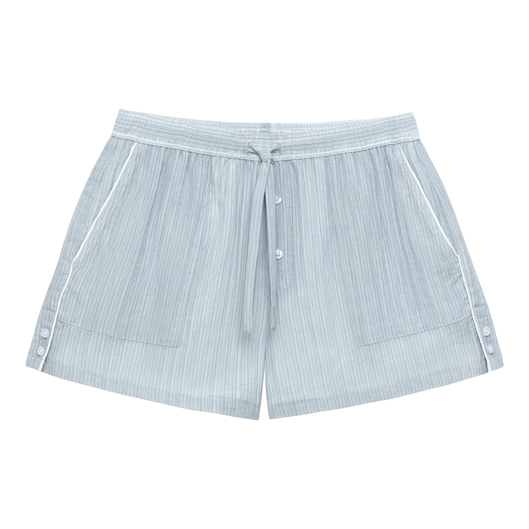 The semi-sheer textured stripe adds subtle intrigue—perfect as a stylish swim cover-up—while the elastic drawstring waistband keeps the fit relaxed. Finished with button and piping details for a polished, refined touch.