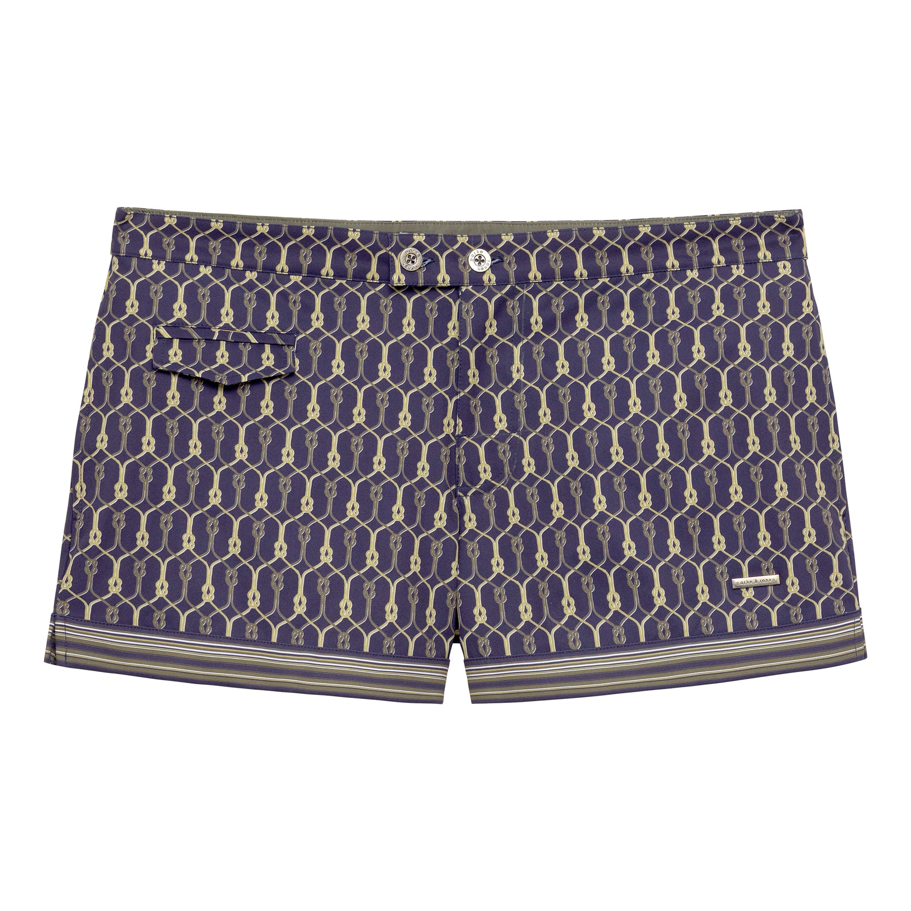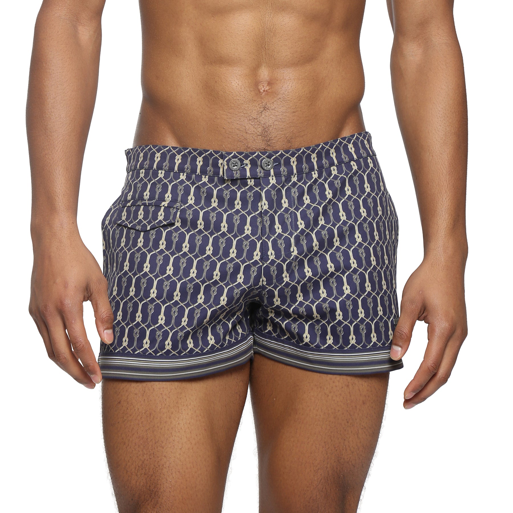Our take on the 70's tennis short. This comfy stretch swim trunk features a double button closure with logo, front coin pocket, side pockets, low-rise and full mesh lining. The Lido Swim Trunk has all the comfort you'll need in a stylishly relaxed cut with a 3 inch inseam