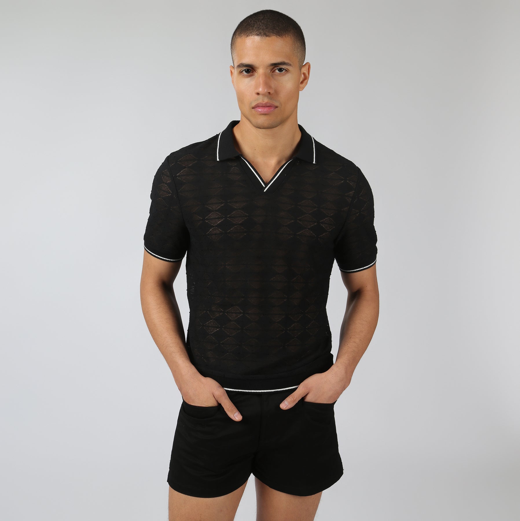 The Chevron Lace Polo is a men’s knitted lace polo shirt featuring a diamond chevron pattern inspired by vintage open-knit styles. Crafted with a breathable lace knit, it balances texture and sheerness with a refined, modern feel.