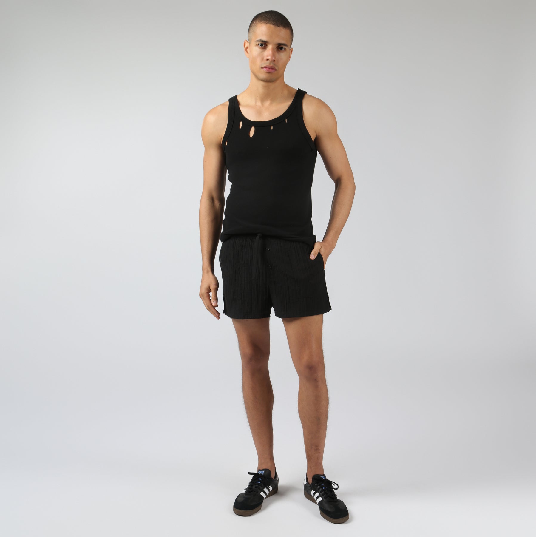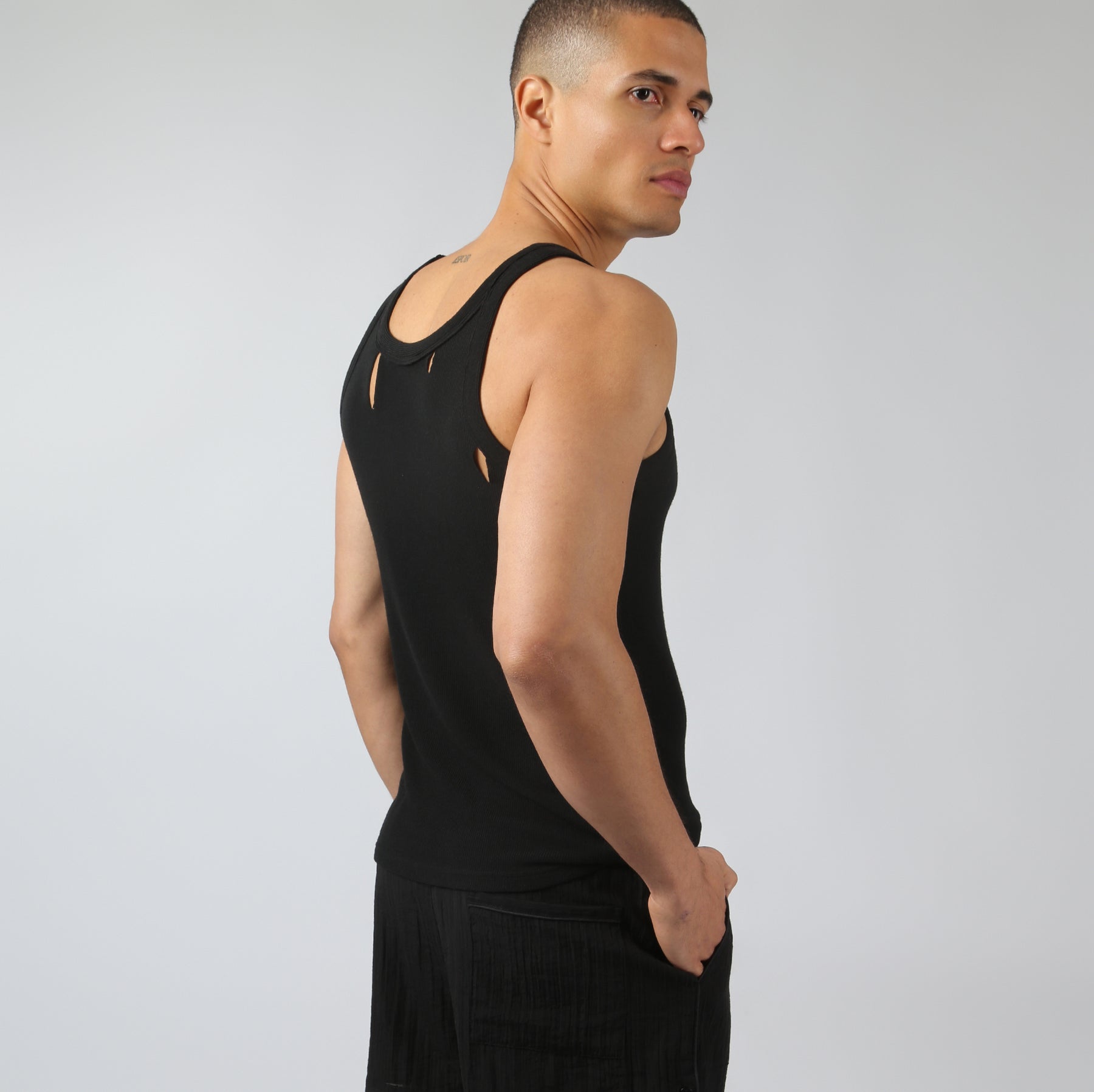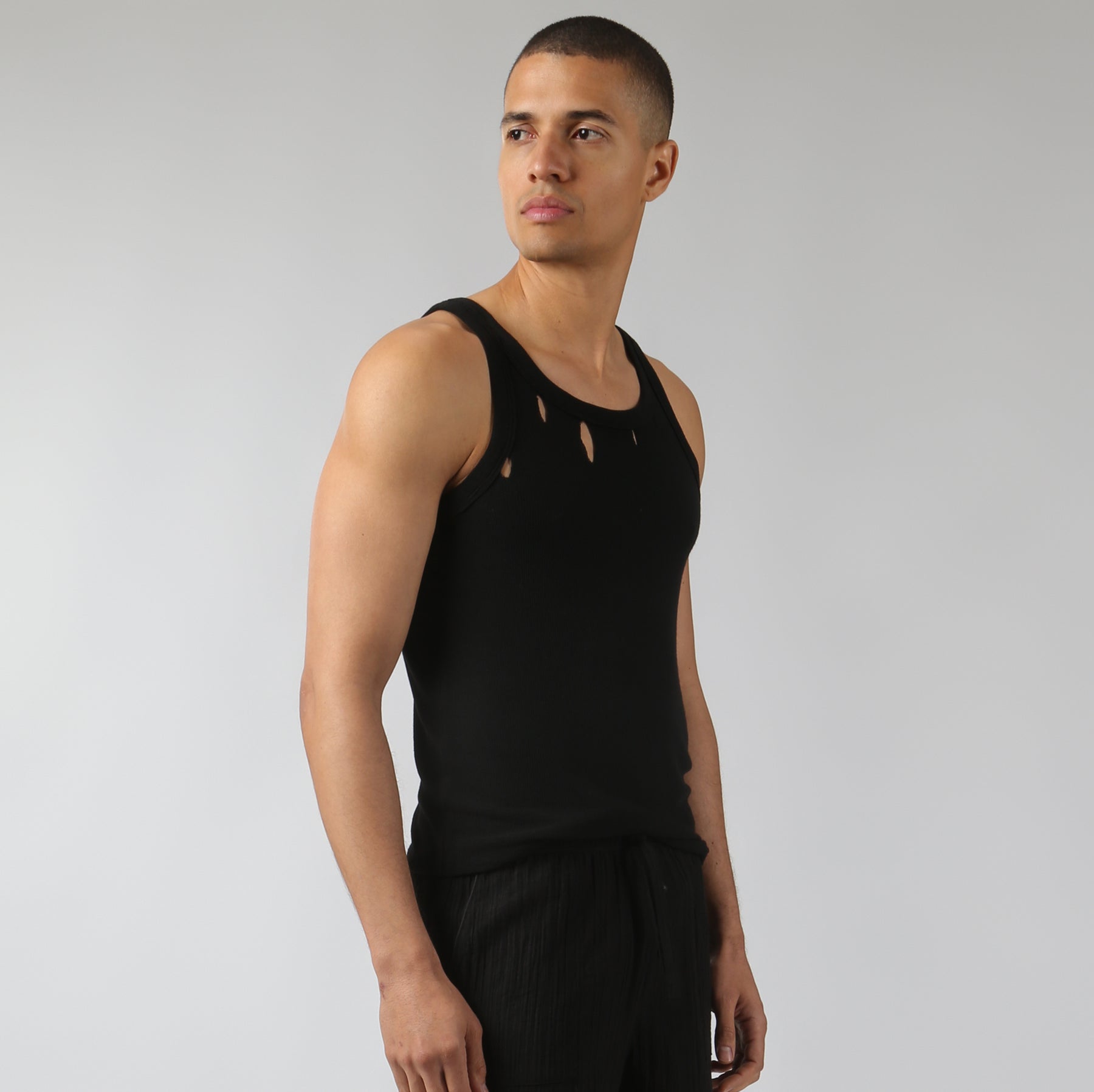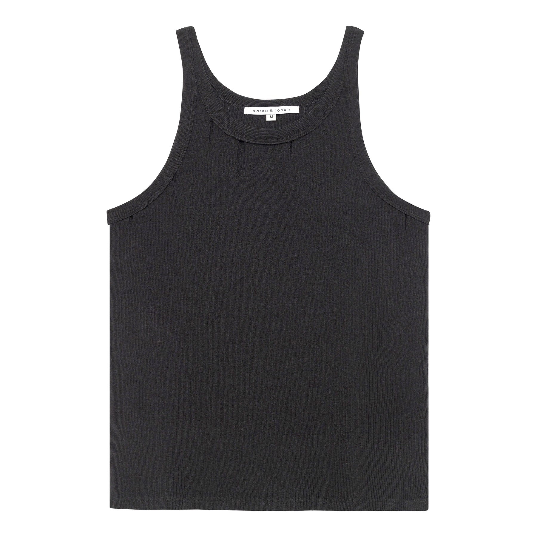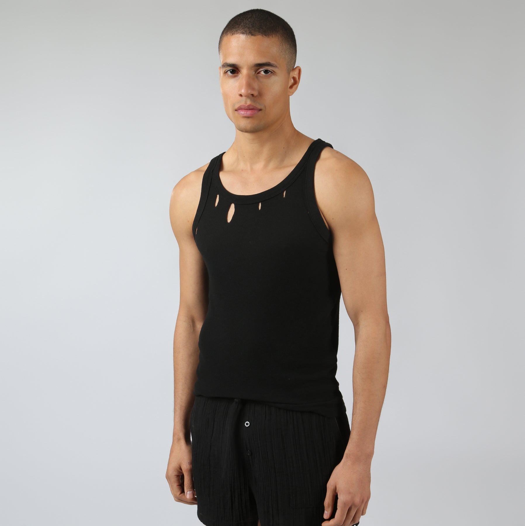 Distressed-inspired raw slash detailing around the neckline adds edge and texture, giving this classic ribbed tank a modern, worn-in attitude that stands out on its own or layered.
