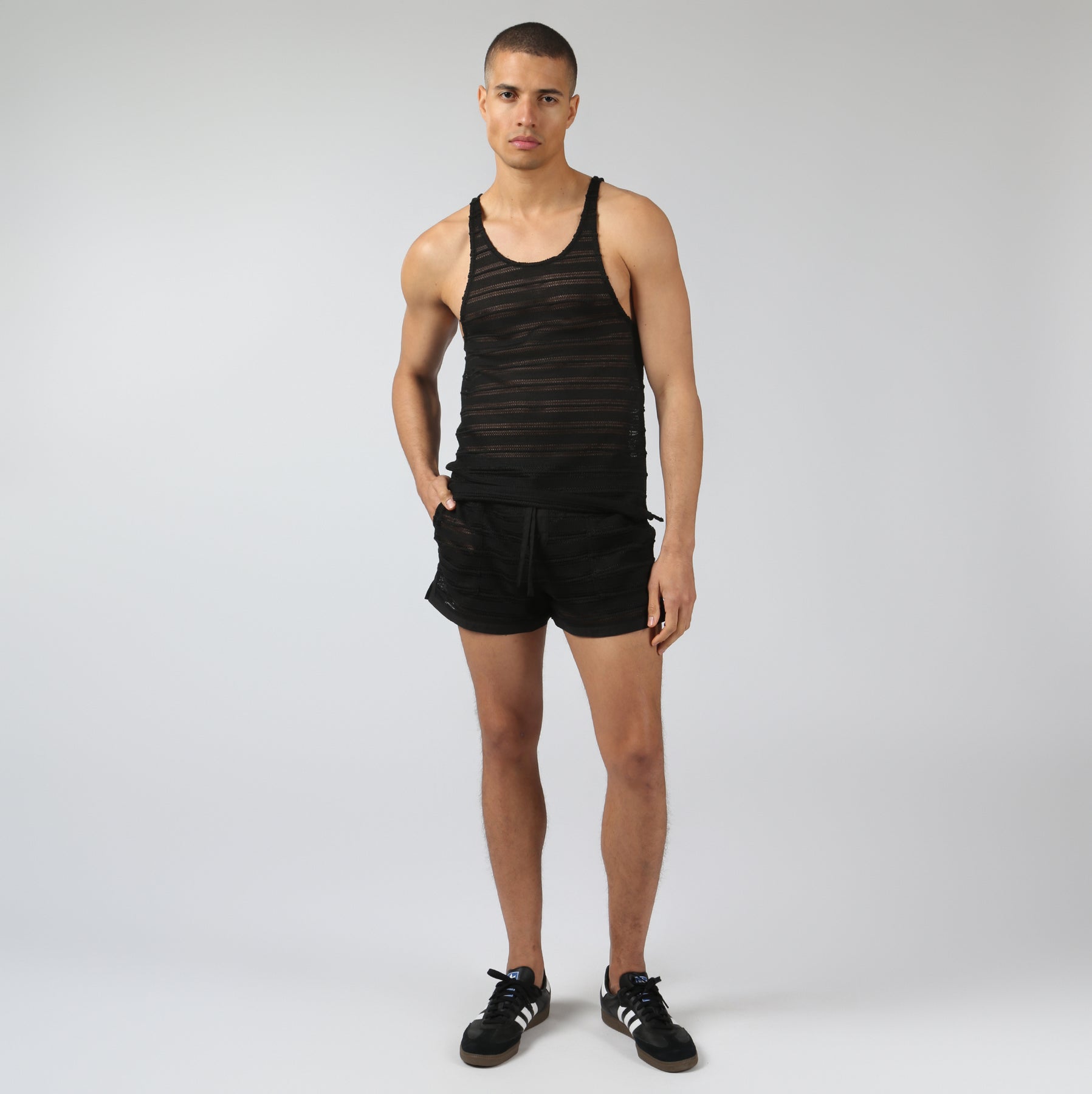 The Sundown Knit Tank is a men’s knit tank top designed for beach vacations, warm weather, and laid-back lounging. Crafted in a crochet-inspired knit stitch, it delivers rich texture with an airy mesh construction that keeps things light and breathable.