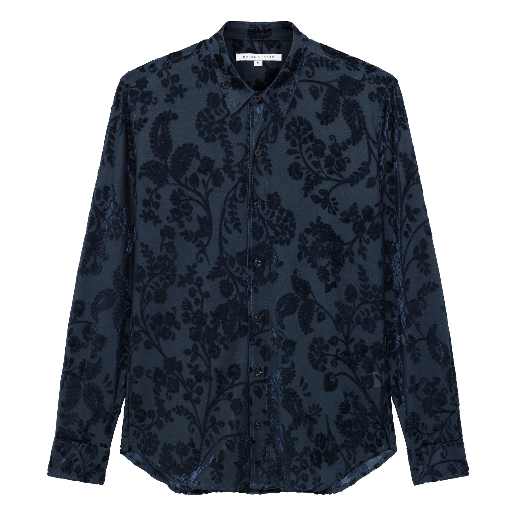 NEW! Time to shine in the Cut Velvet Shirt, our most festive style of the season. Crafted from exclusive cut velvet designs on a lustrous tricot background, this slim-fit shirt offers both stretch and a silky feel. Perfect for making a statement at any holiday event. Machine washable.